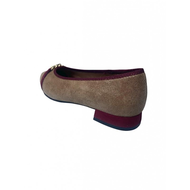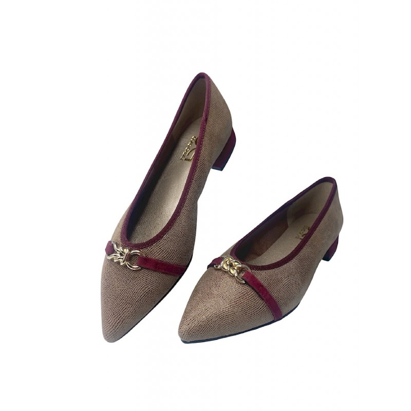BAILARINA FABRICADA EN PIEL E INTERIOR FORRO PIEL. ADORNO DE TIRA EN ANTE BURDEOS CONADORNO METALICO Y TAPA FORRADA EN ANTE. COKO GALVEZ.Recipiente :