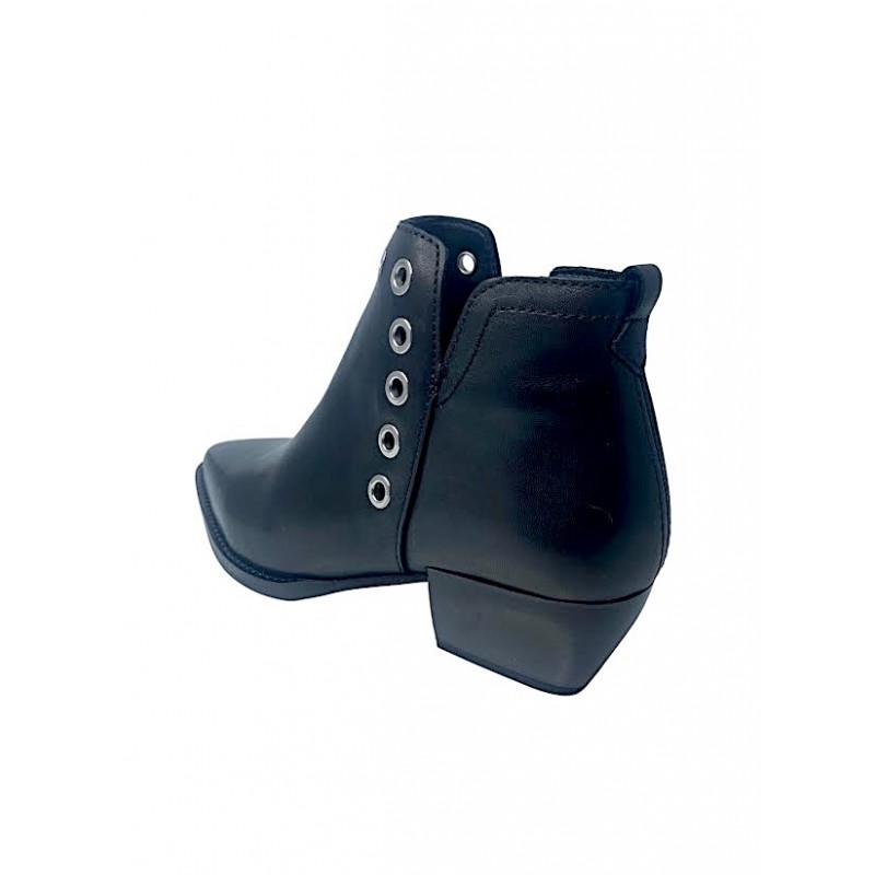 BOTIN DE MUJER FABRICADO EN PIEL E INTERIOR FORRO TERMICO Y PIEL, DISEÑO DE AIRE TEJANO TERMINADO EN PUNTA CON TACHAS PERFORADAS Y ABERTURAS LATERALES. TACON DE 5CM APROX Y CIERRE CON CREMALLERA. COKO GALVEZ.Recipiente :