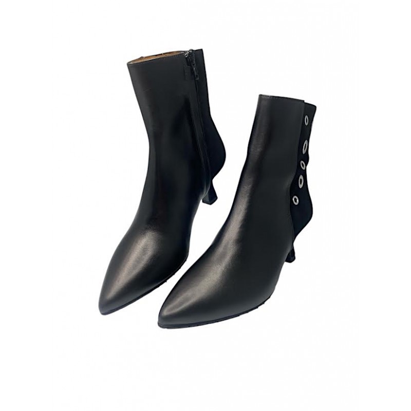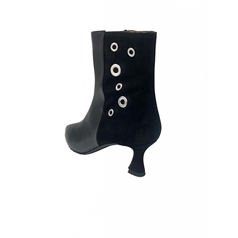 BOTIN DE MUJER FABRICADO EN PIEL Y PARTE POSTERIOR EN PIEL DE ANTE, INTERIOR FORRO PIEL. ADORNO LATERAL DE ARGOLLAS METALICAS Y CIERRE CON CREMALLERA. TACON CARRETE FORRADO DE 6.5CM APROX Y SUELA ANTIDESLIZANTE. COKO GALVEZ.Recipiente :