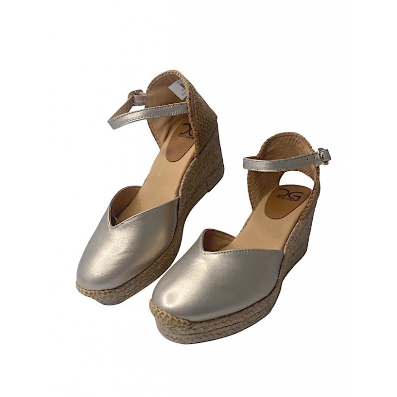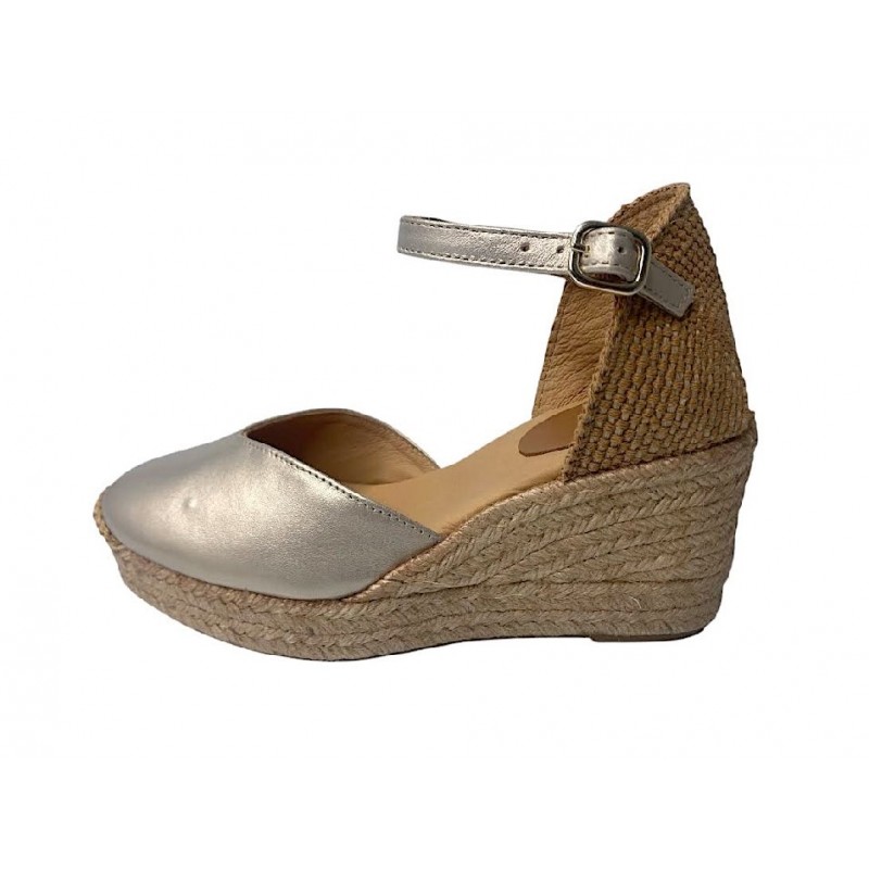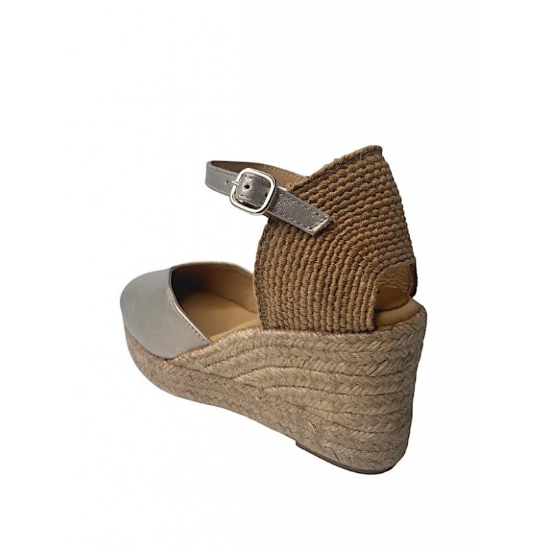 ESPARTO DE MUJER FABRICADO EN PIEL E INTERIOR FORRO PIEL CON PLANTILLA DE GEL. ESCOTE EN FORMA DE CORAZON MUY FAVORECEDOR Y PULSERA CON CIERRE EN HEBILLA METALICA. CUÑA DE 5 CUERDAS Y DOBLE PLATAFORMA. COKO GALVEZ.Recipiente :