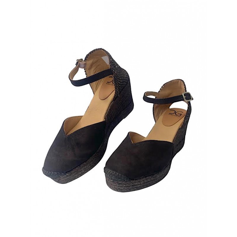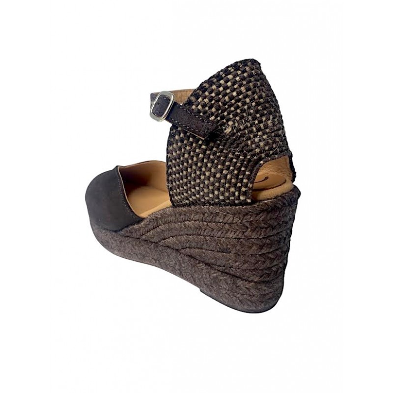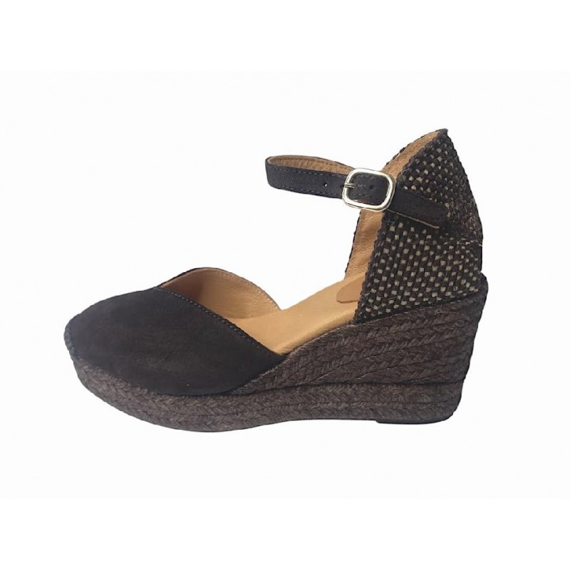 ESPARTO DE MUJER FABRICADO EN PIEL DE ANTE E INTERIOR FORRO PIEL CON PLANTILLA DE GEL. ESCOTE EN FORMA DE CORAZON MUY FAVORECEDOR Y PULSERA CON CIERRE EN HEBILLA METALICA. CUÑA DE 5 CUERDAS Y DOBLE PLATAFORMA. COKO GALVEZ.Recipiente :